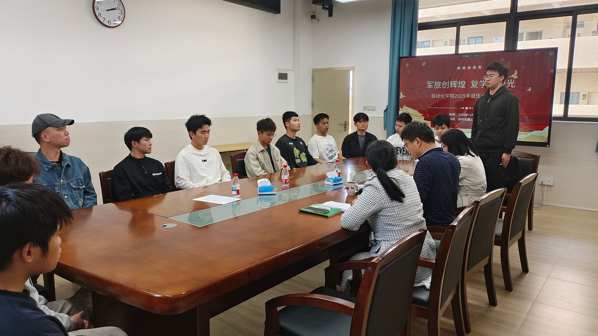 为帮助退伍同学解决复学后在校遇到的困难和疑惑,助力退伍复学同学更快找到角色定位,树立远大理想,2025年12月16日,自动化学院举办“军旅创辉煌,复学续荣光”主题座谈会。学院党委书记史孔仕、党委副书记黄毅、辅导员商余珍与14名退伍复学同学参加了此次座谈会。